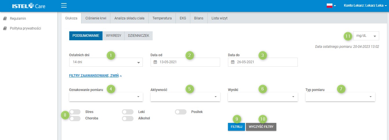 - Medicines – measurement was performed after taking the medicine (if you select this filter and add information about the taken medicine, it will be shown in the section “Recent measurements”, column “Notes”).