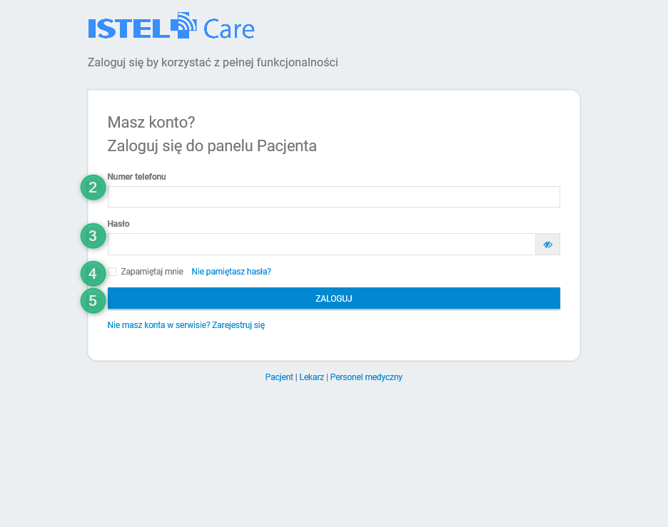 2. Wpisz numer telefonu (patrz 2), który został podany przy rejestracji oraz hasło (patrz 3).